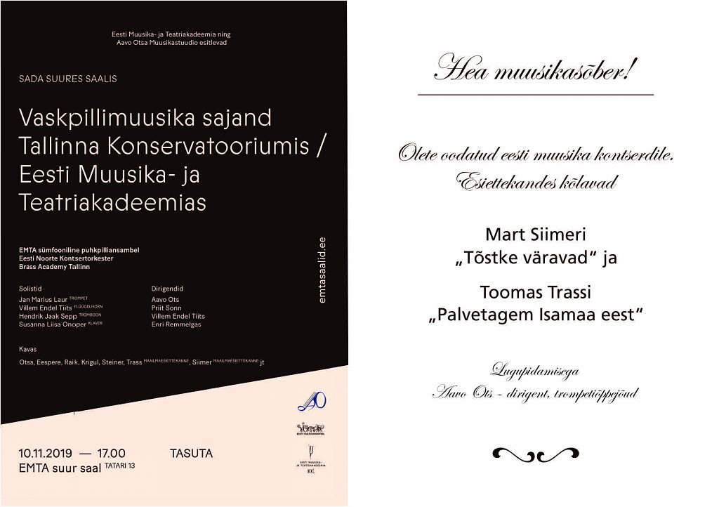 ( pdf 0,1Mb) Eesti Muusika- ja Teatriakadeemia täienduskoolituskeskusTäiendõppe kursus puhkpillimängijatele ja puhkpilliorkestri dirigentideleEesti heliloojate puhkpillimuusika interpretatsioonKursus, konverents ja kontsertKursus ja konverents toimuvad koostöös Eesti Puhkpillimuusika ÜhingugaAeg 9. november 2019, kell 10.30Koht Eesti Muusika- ja Teatriakadeemia, Tatari 13, 10116 TallinnMaht 7 tundi (koos konverentsiga)Maksumus 35.- eurotRegistreerimine 7. novembrini 2019 aadressil https://sise.ema.edu.ee/tk/index. xKursuse eesmärk tutvustada erinevaid võimalusi eesti puhkpillimuusika interpreteerimiseks*anda ülevaade eesti rahvusliku puhkpillimuusika arenguloostKursuse sisu10.30–13.30 (EMTA kontrserdisaal)• Ettevalmistus teoste esiettekandeksOrkestrikursus koostöös heliloojatega: puhkpillide kontsertmuusika interpretatsioon (Krigul, Siimer, Trass)Mart Siimer „Tõstke väravad“ – pühendatud EMTA juubelile ja ansamblile Tallinn Brass Academy. Teose tellimist toetas Kultuuriministeerium.Toomas Trass !OREMUS POR LA PATRIA! Pühendatud oma isa prof Hans-Voldemar Trassi (1928–2017) mälestusele. Teose tellimist toetas Kultuuriministeerium.• Vaskpillide grupiproovid – Priit Sonn• Puupillide grupiproovid – Aavo OtsÕpiväljundidKursuse läbinu tunneb eesti rahvusliku puhkpillimuusika arengulugu ning kasutab erinevaidvõimalusi eesti heliloojate puhkpillimuusika interpreteerimisel.Konverents 9. nov kl 14.00–17.00Eesti puhkpillimuusika arengujooni„Sajandi kõlad Eesti rahvuslikus puhkpillimuusikas“Peterburi Konservatoorium – Tallinna Konservatoorium/EMTA100 aastat vaskpillimuusikute koostööd Tallinna Konservatooriumi rajajad Peterburi Konservatooriumi vaskpillierialade lõpetanud J. Aavik, J. Vaks (trompet), J. Tamm (corno), R. Kull (tromboon)Lektor Aavo Ots.Väägvere pasunakoor 180 – ajalugu ja tänapäevLektor Priit SonnEesti puhkpillimuusika suurkuju Rein Ploomi teosed puhkpilliorkestrile. CD orkester „Helikon“ esituses – dirigent Toomas VäljaLektor Toomas VäljaDVD Rene Eespere sümfooniline puhkpillimuusikaLektor Aavo OtsBrassansambli õppeaine kui vaskpillide kammermuusika TRK/EMTA 1986–2019.Vaskpillikoosseisude EMTA brass ja Tallinn Brass Academy tegevus Eestis ja välismaal. Brass Academy CD 1997Lektor Aavo OtsNelja muusikakõrgkooli – EMTA, Leedu Muusikaakadeemia, Läti Muusikaakadeemia ja Sibeliuse Akadeemia – festivalid Baltic Nordic Brass Academy 2014–2018Lektor Villem Endel TiitsEesti Noorte Kontsertorkester ja Eesti Noorte Brass WASBE konverentsidel Debrecenis 2014 ja Prahas 2016Lektorid Eesti Puhkpillimuusika Ühingu juhatuse esimees Kaido Kivi ja dirigent Enri Remmelgas.