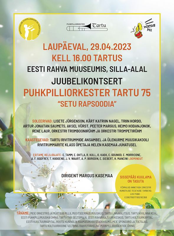 ( pdf 1,4Mb) Laupäeval 29. aprillil 2023 kell 16.00 Tartus, Eesti Rahva Muuseumis Puhkpilliorkester Tartu 75. sünnipäevakontsert.