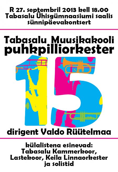 ( jpg 0,2Mb) Reedel 27. septembril 2013 kell 18.00 Tabasalu Ühisgümnaasiumi aulas Tabasalu Muusikakooli puhkpilliorkestri 15. sünnipäevakontsert.